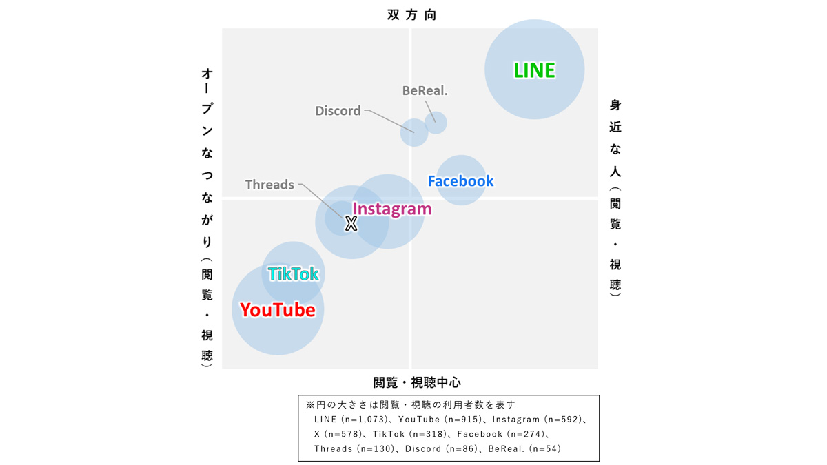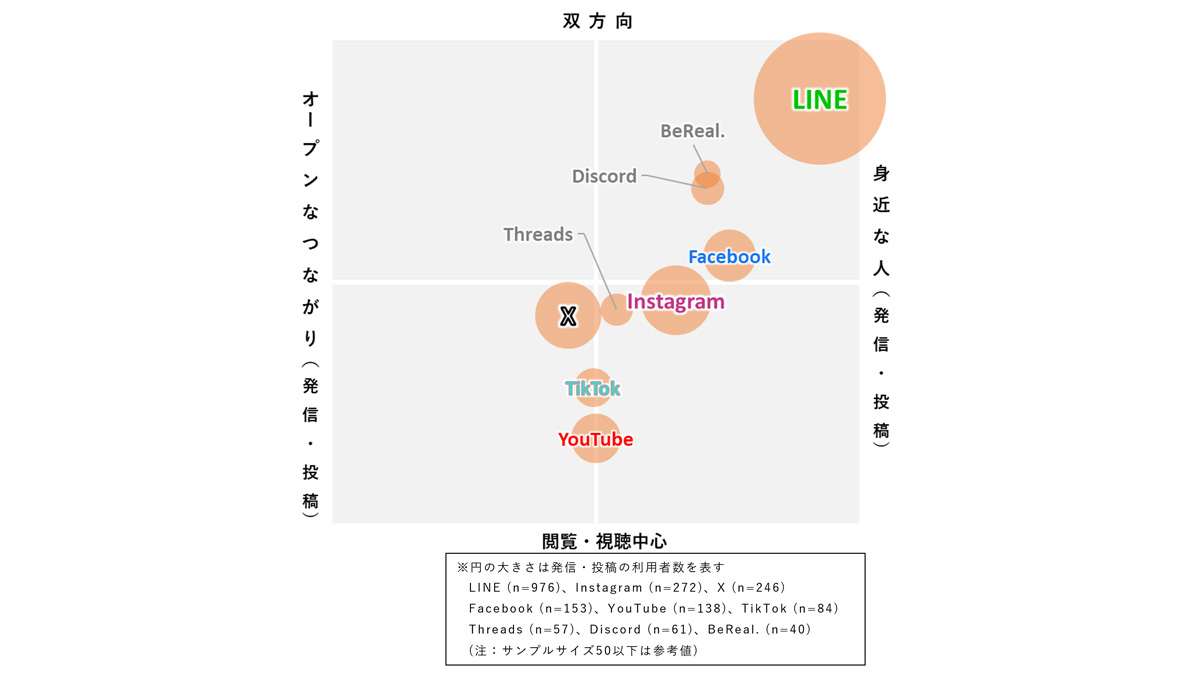 Instagramはその中間にあり、閲覧・発信のどちらにおいても利用が特定方向に偏らず、幅広いつながり方で使われるサービスであることがわかる。 これらの結果から、主要なソーシャルメディアはそれぞれ異なる特徴を持ち、利用者が目的に応じて使い分けている様子が確認できる。