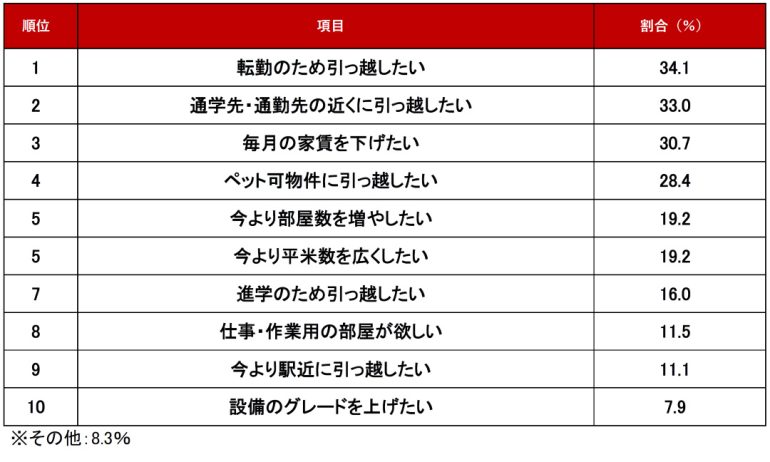 3位は「毎月の家賃を下げたい」。不動産会社からは「物価高の影響で、家賃そのものだけでなく、入居後のランニングコストをシビアに計算する方が増えている」というコメントが上がり、昨年同様“物価高”というキーワードが多く見られた。