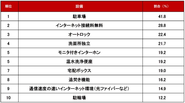 設備編の1位は「駐車場」となった。不動産会社からは、「複数台車両を所有するお客さまが多く、物件探しの第一条件が駐車場の空きである場合が多い」「来客用にも駐車場が欲しいというお客さまがいた」というコメントが見られた。