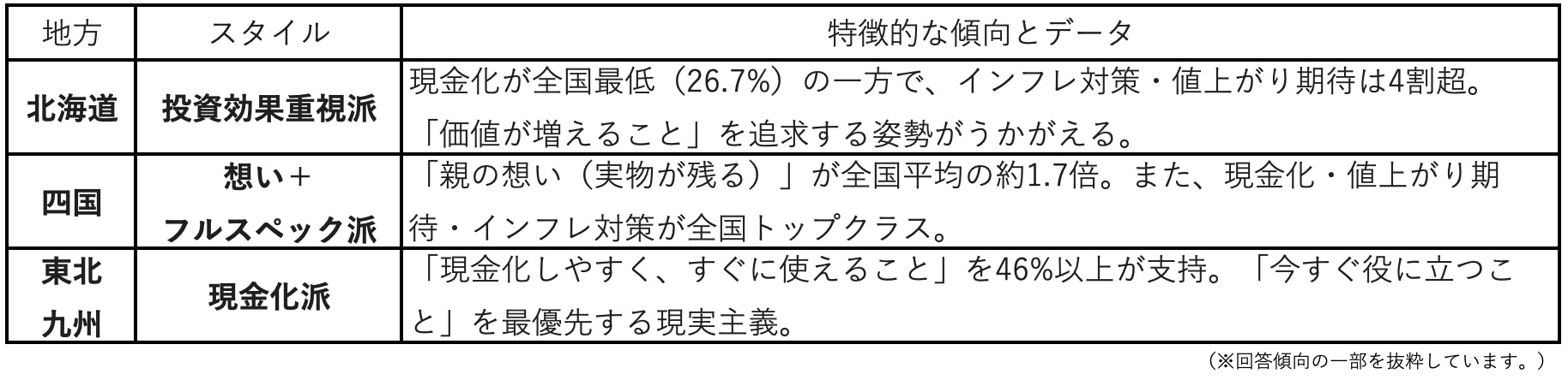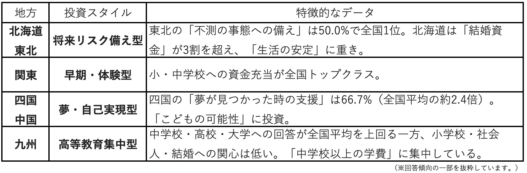 特に四国については(1)(2)を通じて、子を応援する親の想いが資産形成・資産運用のあり方に反映される結果となり、東北については資産を現金化するなどし、不測の事態にすぐ使用できることを重視する現実的なパパママ投資家が多いことがわかった。