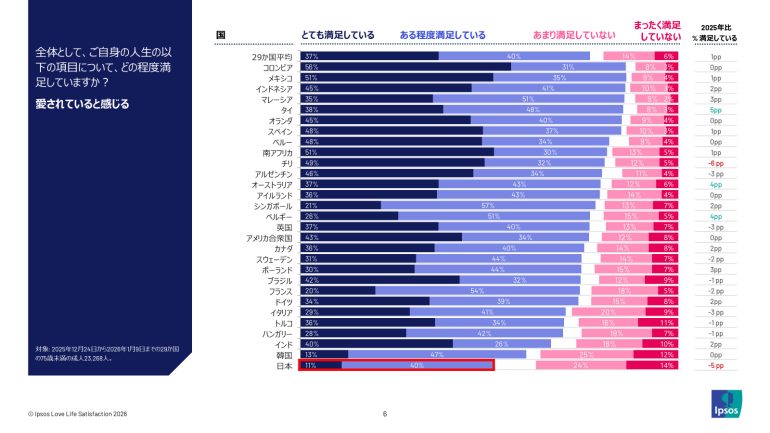 また、日本で「恋愛や性生活」に満足していると回答したのは33%であり、2025年から6ポイント減少、29か国中最も低い満足度となっている。