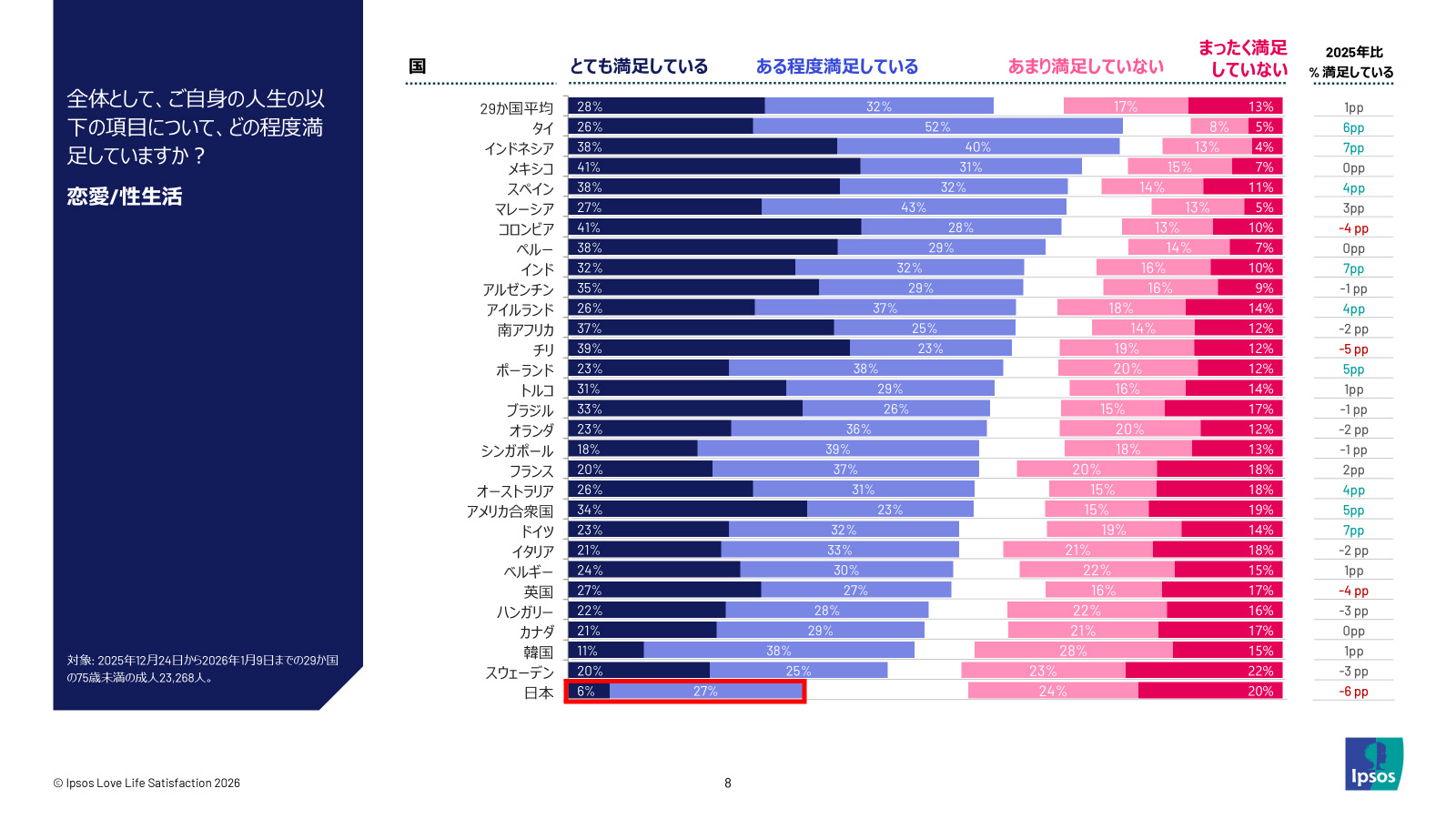 また、日本で「恋愛や性生活」に満足していると回答したのは33%であり、2025年から6ポイント減少、29か国中最も低い満足度となっている。