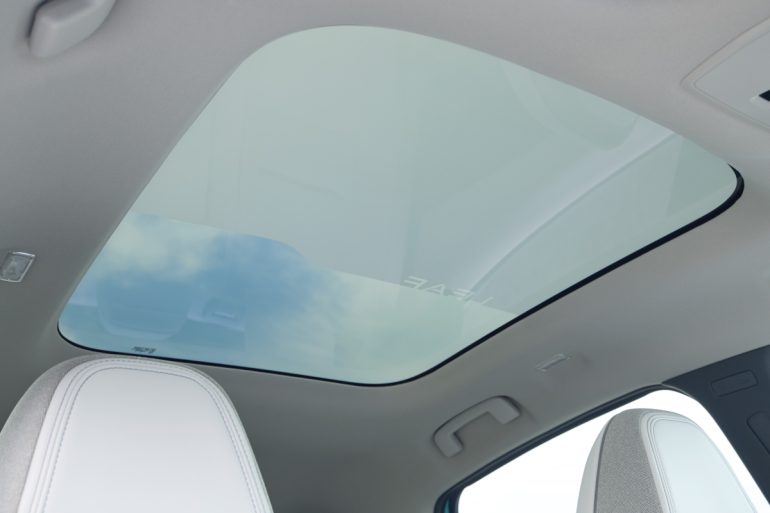 そのほかの装備面ではメーカーOPでAC100V/1500Wコンセント(センターコンソール後端とラゲッジルームの2か所。60000円/税別)を用意。さらに日産初の液晶ガラスによる調光パノラミックガラスルーフ(メーカーOP/22万5000円/税別)の装着も可能。遮熱コーティングによって遮熱効果が得られ、室内の暑さ低減とともにエアコンの負荷低減効果が期待でき、さらに日が差すと液晶ガラスに刻まれたLEAFの文字がシートに投影されるオシャレな演出もあったりする。
