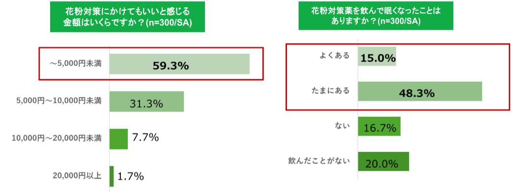 政府では花粉症対策薬などOTC類似薬の保険適用外を検討しており、今後値段が上がる可能性がある。一方調査では、花粉対策にかけてもいい金額として「~5,000円未満」と回答した人が59.3%と最多となり、高額な費用をかけたくない層が多いことがわかった。