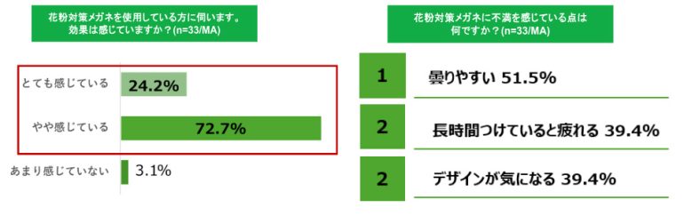 花粉対策メガネを使用している人の96.9%が「効果を感じている」と回答。一方不満点としては「曇りやすい」「長時間つけると疲れる」「デザインが気になる」などが挙げられており、自分に合った商品選びや正しい使い方が重要であることも明らかになった。