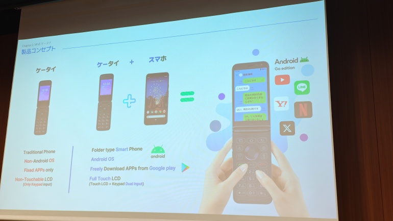 「ガラケーみたいだけど、ちゃんとスマホ」をコンセプトとするケースマは、従来のケータイの形状と物理キーの操作性を維持しつつ、LINEやYouTubeなどのAndroidアプリが使えるスマホだ。つまり、外側はガラケー、内側はスマホという、一風変わった端末となっている。