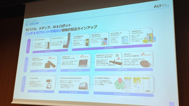 ALTは韓国にて、大手3キャリアに端末を展開するメーカーだ。ライセンスを取得して正式にポケモンスマートフォン、シナモロールスマートフォンといったキャラクター端末も展開しており、特にキッズ、シニアといった世代に向けたデバイスを手広く手掛けている。
