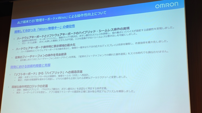 ケースマでは、テンキーでの文字入力を快適にするため、オムロン ソフトウェアの日本語入力システム「Wnn(ウンヌ)」または「iWnn」を搭載する。これにより、ガラケーのような予測変換と「打つ喜び(クリック感)」を実現し、画面を見ずに打つブラインドタッチも可能となる。スマホでのフリック入力に慣れている筆者からすると、文字入力にはかえって時間がかかるが、確実さはやはり大きな魅力だ。