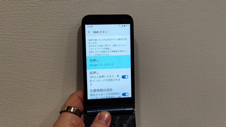 シニアやキッズに向けたデバイスとして、本体側面には「SOSボタン」が搭載されている。SOSボタンを長押しすると、事前に登録していた緊急連絡先へと、位置情報とSMSが送信される仕組みとなる。