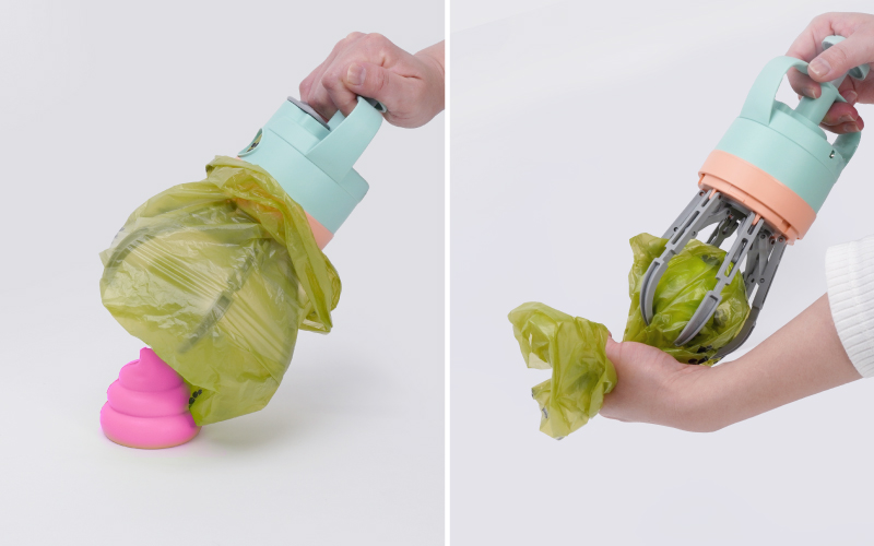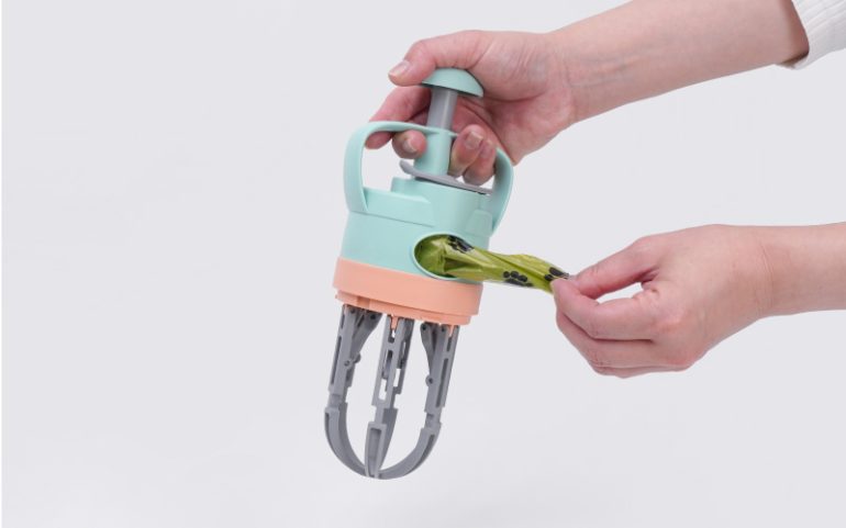 本製品は、ペットの散歩時や清掃時の「触りたくない」という悩みを解消する、新発想のフンキャッチャー。使い方は非常に簡単で、本体先端のクリップ部分に袋を被せ、ボタンを押して掴むだけ。6つのアームが草むらや砂利の上でも対象物をしっかりホールドし、手を一切汚さずに回収から処理までを完結できる。