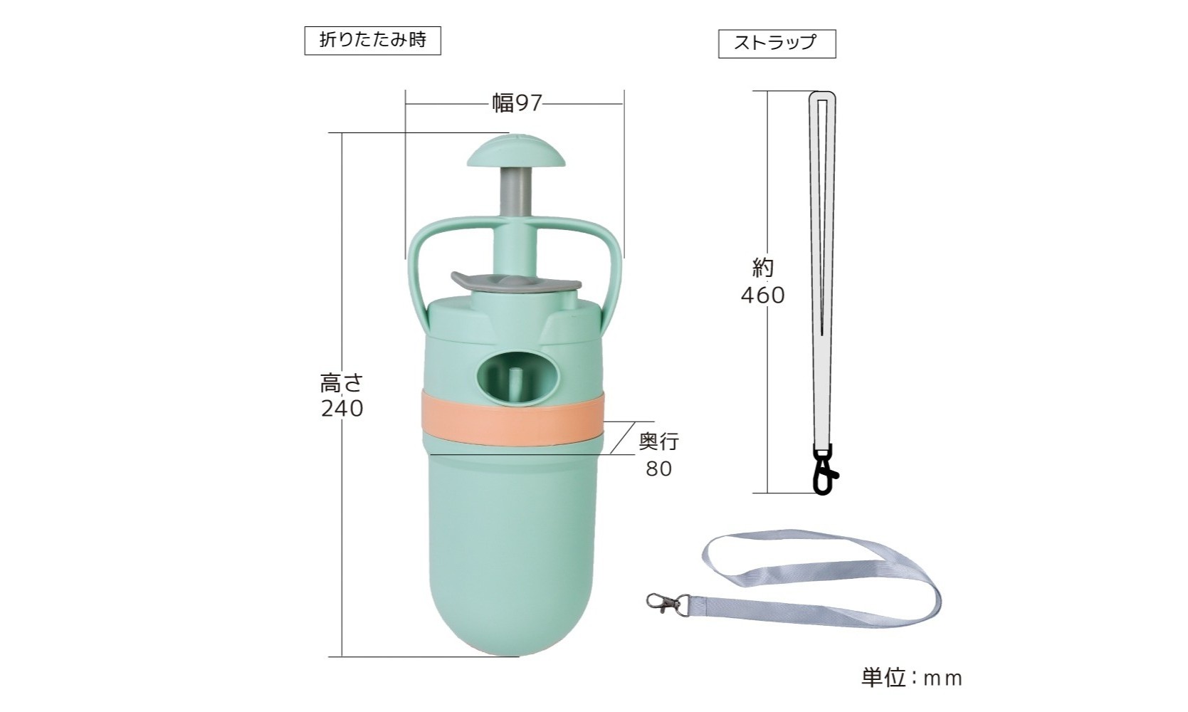本体サイズは幅97×奥行80×高さ240mm、重量は約280g。セット内容は本体、クリップカバー、ストラップ、専用袋(1ロール)、日本語取扱説明書。