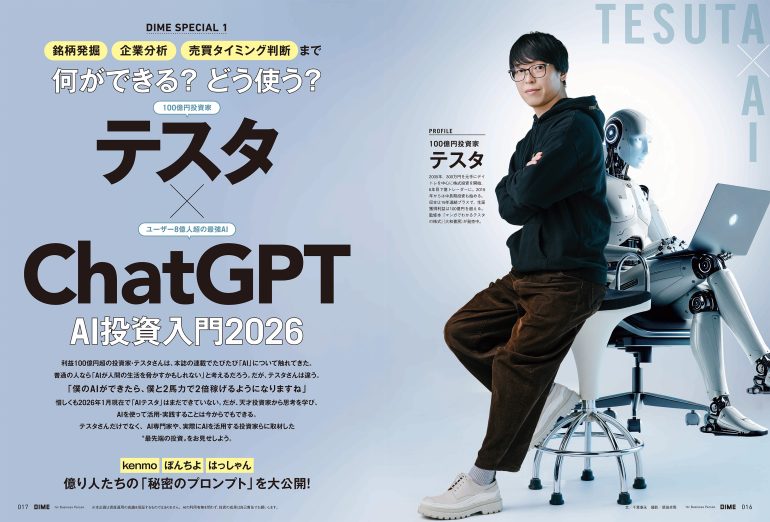 2月16日発売の雑誌『DIME』4月号では、資産運用における最強のパートナーとしても注目の「生成AI」を使い倒すためのノウハウを凝縮した大特集「テスタ × ChatGPT AI投資入門2026」を展開します。