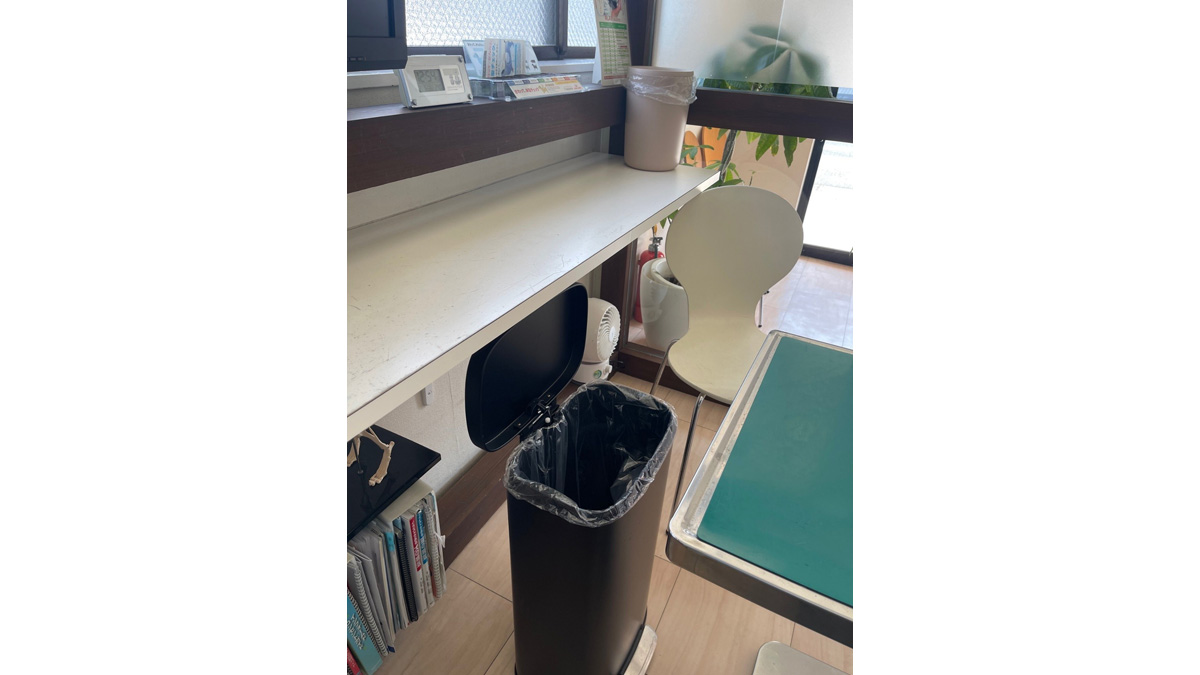 「実際に置いてみると、ホームセンターのゴミ箱よりもしっかりした印象となり、色も形も合わせやすくて良かったです。今まで使っていたごみ箱よりも少し大きめだったのですが、部屋に合う大きさでした」と、動物病院での使用にも好印象な仕様だった。