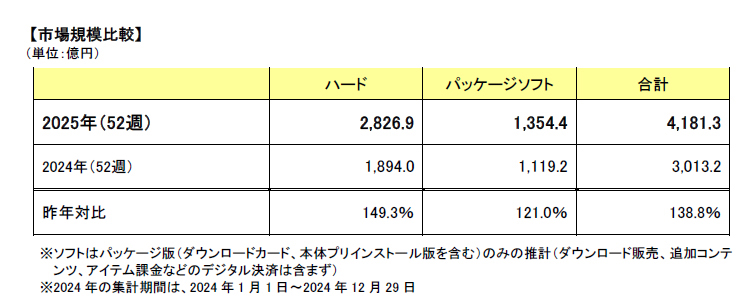 2025年の国内家庭用ゲーム市場規模は、ゲームハードが前年同期比149.3%の2826.9億円、パッケージソフトが前年同期比121.0%の1354.4億円、合計で同138.8%の4181.3億円と前年から拡大していた。