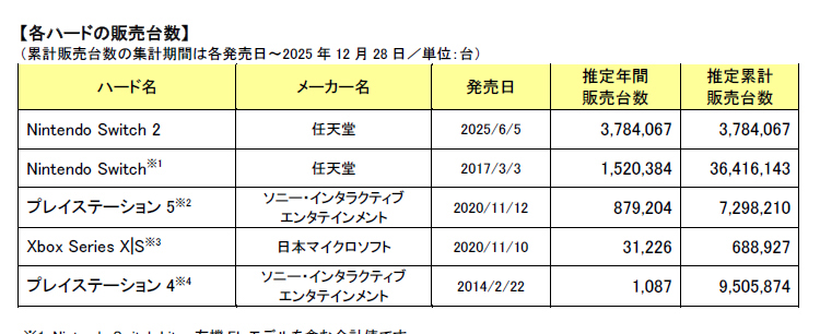 ゲームソフト市場では、『Switch 2』で発売された『マリオカート ワールド』が266.8万本で首位を獲得した。人気シリーズ最新作の『Pokémon LEGENDS Z-A』(ポケモン/2025年10月16日発売/『Switch 2』・『Switch』)も順調に販売本数を伸ばており、2機種合計で年間253.4万本を販売した。合算ではソフトランキング首位に迫る数字だった。ゲームソフトでは、ベスト10のうち、5本が任天堂のタイトルだった。そんな中で『PS5』で発売されたカプコンの『モンスターハンターワイルズ』が4位に入る健闘をみせた。