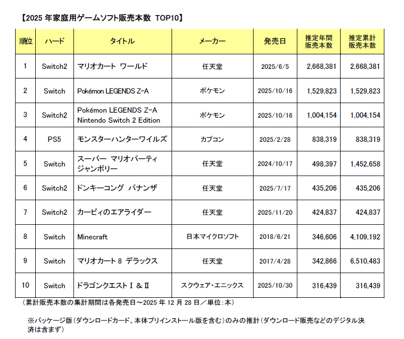 ゲームソフト市場では、『Switch 2』で発売された『マリオカート ワールド』が266.8万本で首位を獲得した。人気シリーズ最新作の『Pokémon LEGENDS Z-A』(ポケモン/2025年10月16日発売/『Switch 2』・『Switch』)も順調に販売本数を伸ばており、2機種合計で年間253.4万本を販売した。合算ではソフトランキング首位に迫る数字だった。ゲームソフトでは、ベスト10のうち、5本が任天堂のタイトルだった。そんな中で『PS5』で発売されたカプコンの『モンスターハンターワイルズ』が4位に入る健闘をみせた。