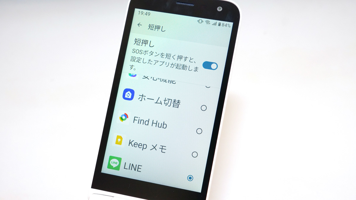側面にはSOSボタンが搭載されている。長押しすると、緊急連絡先に電話できるというものだ。このボタンには、短押しにさまざまアプリを割り当てることが可能。LINEのように、Google Playからダウンロードしたサードパーティのアプリも設定できる。電話とメッセージと、プラスαとしてよく使うアプリをサッと呼び出せるのは便利。メッセンジャー以外だと、PayPayなどの決済系アプリを設定してもいいだろう。
