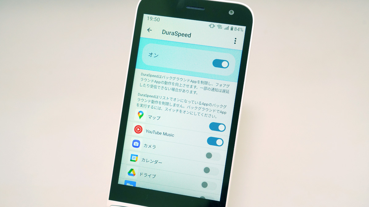 バッテリーの容量は2100mAhで、一般的なスマホと比べると少ないが、電話やSMSを待ち受けているだけだと、思ったよりも減り方は緩やかだ。この機種には、「DuraSpeed」というアプリのバックグラウンド動作を制限する機能が標準で搭載されているからだ。これを切っておかないと、LINEの通知も届かないことがある。ケータイとして使えるように、制限をかけているというわけだ。