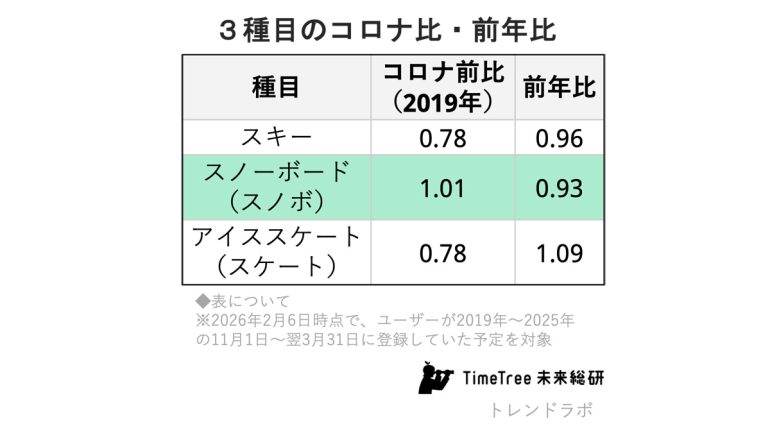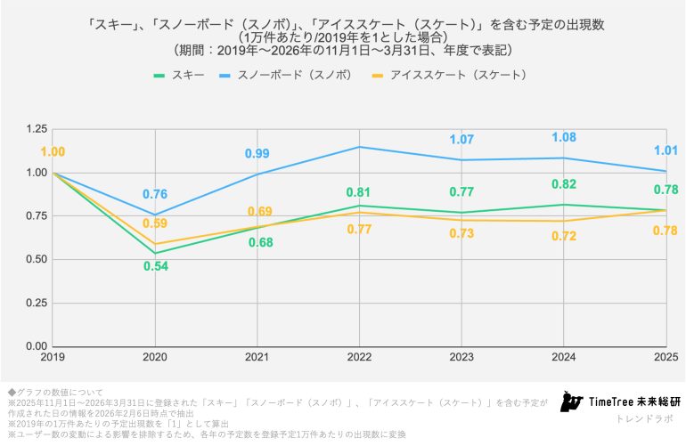 予定データは、ウィンタースポーツの未来を静かに映し出しています。TimeTree未来総研は、こうした人々の予定に刻まれた選択から、社会の変化の兆しを読み解き続けてまいります。