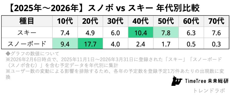 スキーは前年比96%、コロナ前比78%と回復が遅れているものの(冒頭のグラフ)、30代以降の世代では根強い人気を維持していた([2025年~2026年]スノボvsスキー年代別比較より)。