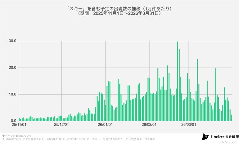 日別の予定の推移をみると、スノーボードと同様に、2月中旬~下旬に大きなピークを迎えるスキー。2月21日(土)には29.9件と、予定登録出現数が期間中(2025年11月1日~2026年3月31日)の最高値を記録した。