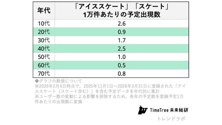 1万予定あたり1.63件と規模はまだ小さいアイススケート。年代別では、10代が2.58件と最も高く、40代も2.49件と高い水準に。