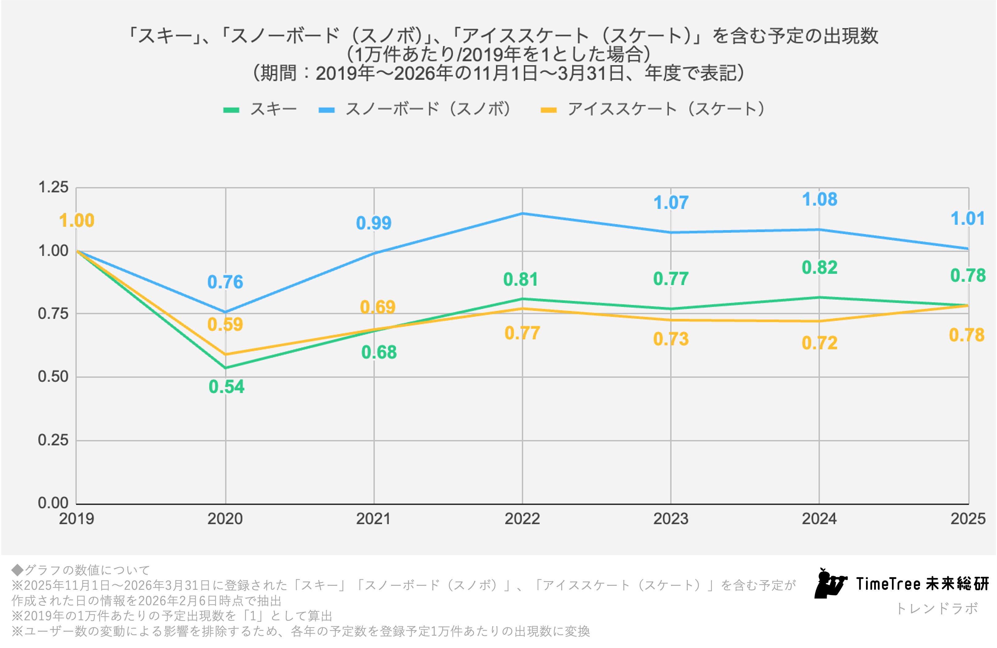 予定データは、ウィンタースポーツの未来を静かに映し出しています。TimeTree未来総研は、こうした人々の予定に刻まれた選択から、社会の変化の兆しを読み解き続けてまいります。