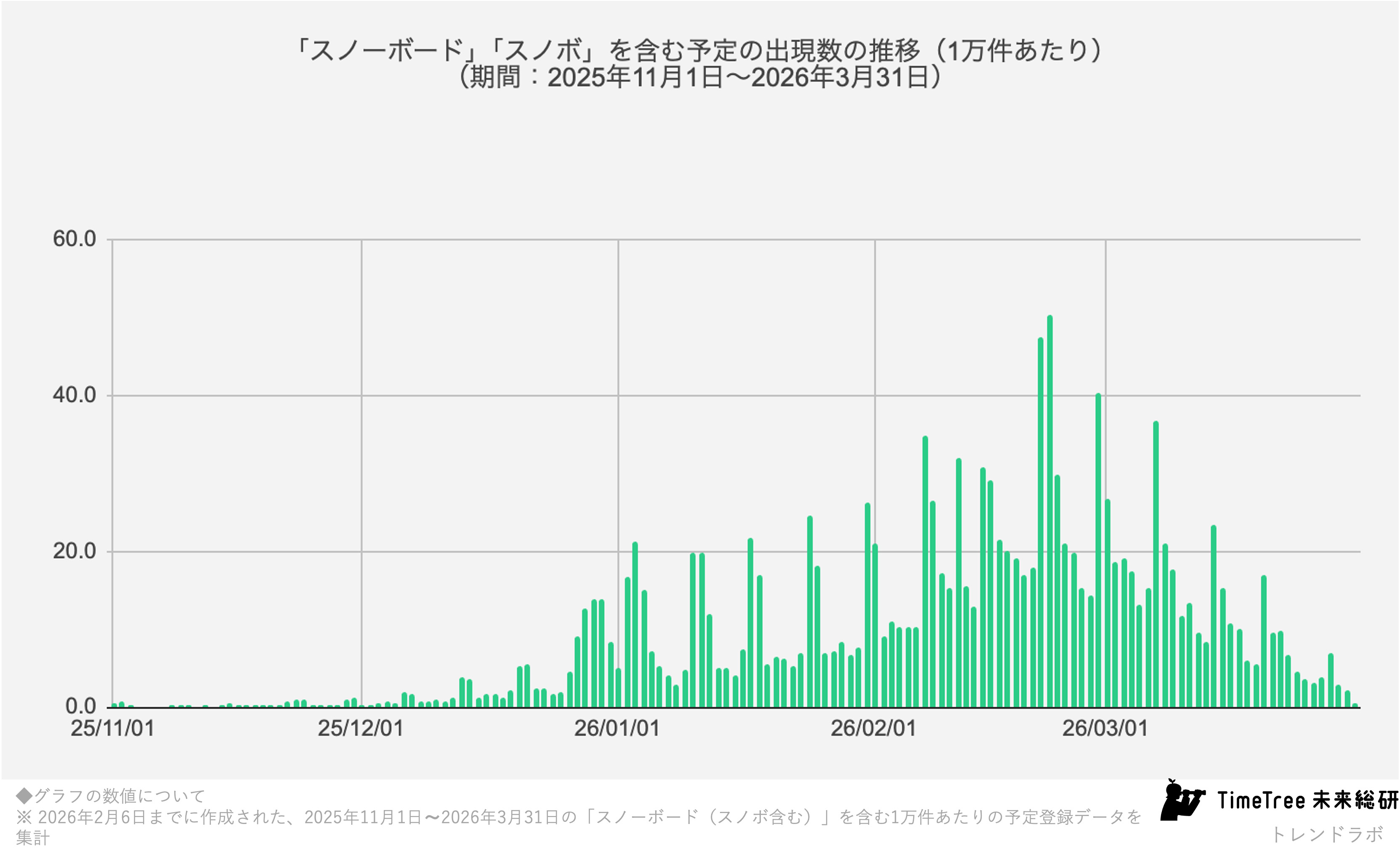 スノーボード(『スノボ』キーワード含む)の日別の推移をみると、11月から徐々に高まり、1月中旬以降さらに増加、2月下旬に最大のピークを迎えることが明らかに。