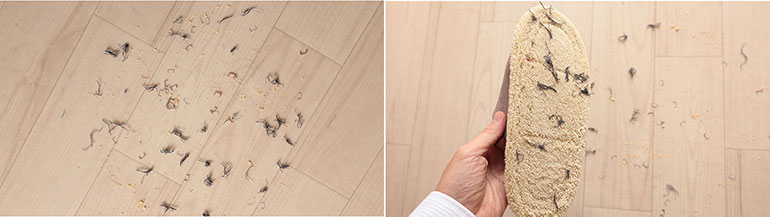 検証のため、床の一か所に、繊維くず、髪の毛、粉(きな粉)、ホチキスの針をばらまき、片足だけスリッパを履き、床を2回通行した。ビフォーアフターが以下の写真となる。