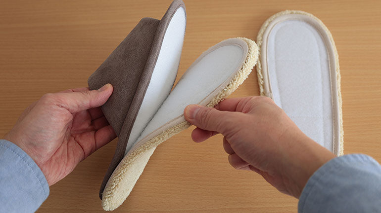 なお、汚れてしまったソールは洗って再利用できる。このソールは、面ファスナーでスリッパ本体に貼り付いており、はがして洗濯ネットに入れて洗濯機で洗えばOK。