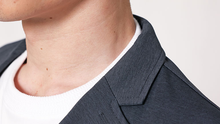 後ろ襟はやや高めに設定。ジャケット着用時の首元を美しく見せると同時に、社員証などのネックストラップが肌に直接当たらないよう配慮した。すべては、「ジャケットありき」で考え抜かれた設計だった。