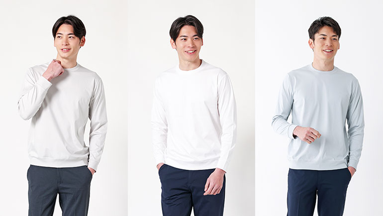 編地は、一般的な天竺編みではなく、2層構造のスムース編み。生地に厚みと密度を持たせることで、透けにくく、体のラインも拾いにくい設計にしている。体系の崩れが気になる働き盛りの世代には重要なポイントだ。
