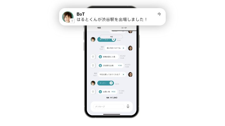 「BoTトーク」は、AIが移動履歴や音声メッセージから家族の行動習慣ややりとりを学習し、各家庭それぞれにパーソナライズされた見守りを実現する“AI見守りロボット”。手のひらサイズのデバイスを持ち歩くだけで、位置情報を保護者に知らせする見守り機能に加え、BoTトークと保護者のスマートフォン間で音声メッセージの送受信を無制限に行なうことができるので、トラブルの際のSOSはもちろん、日常の連絡も家族間で取り合えるコミュニケーションツールとしても活躍する。