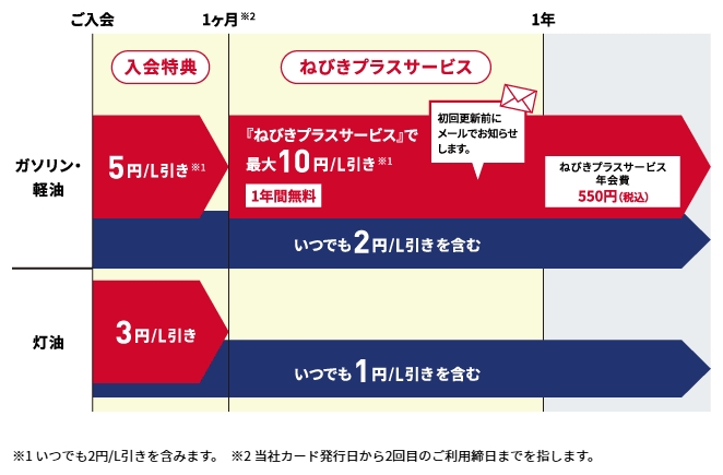 入会特典として最初の1か月間は5円引き。年会費550円(初年度無料)の『ねびきプラスサービス』に加入すると、月間のショッピング利用額に応じて最大10円引きになる。月額3万円以上の利用で3円引き、月間10万円以上の利用で10円引きといった具合だ。