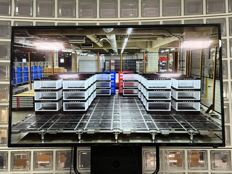 「CUEBUSは世界初のリニアモーターを使用した都市型立体ロボット倉庫で、商品をロボットが運んでくることで、商品を取り出す効率を高める自動走行システムです。通路が不要で、天井ギリギリまで収納できる高い格納率があり、すべての棚を即座に動かすことができます。