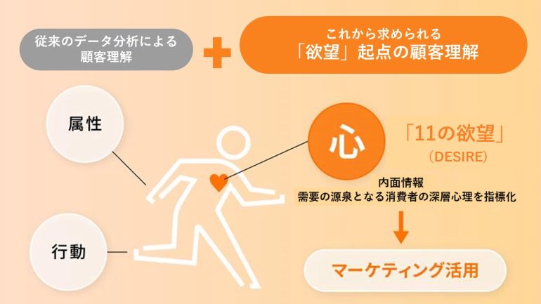 企業が自社メディアやECサイトなどを通じて取得した顧客の行動履歴であるファーストパーティデータと「11の欲望」を連携。心理と行動の両面から精度の高い顧客分析を実現することで、効果的なマーケティング施策の実施等を支援していく。