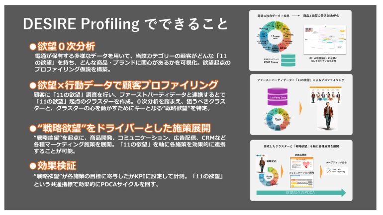 「DESIRE Profiling 」は、ファーストパーティデータの活用において、この「11の欲望」を取り入れ、「11の欲望」を起点に顧客データを統合・分析。マーケティング施策へとつなげるパッケージ・ソリューションだ。