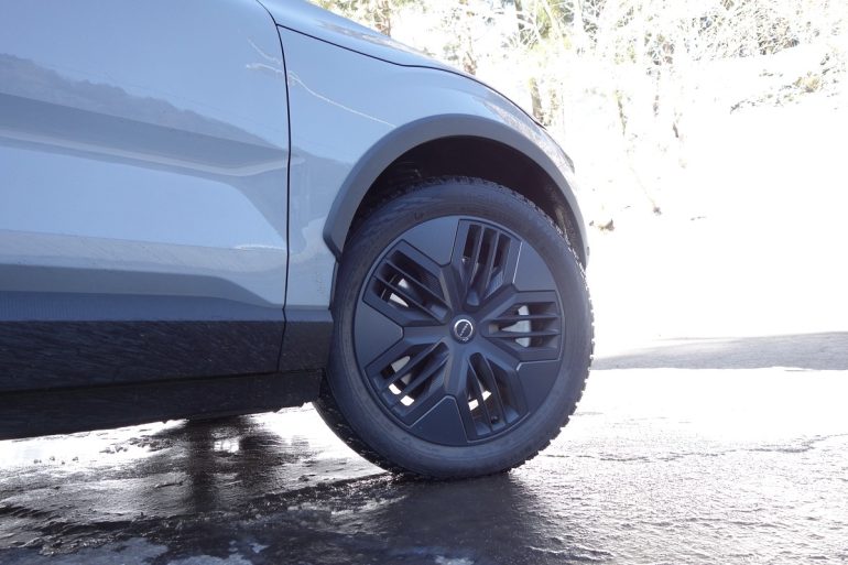 走行性能にかかわる部分では、EX30 Cross Country Ultra Twin Motor Performanceの場合、総電力量69kWhバッテリーによる最高出力はフロント156ps、リヤ272psの前後2モーターを搭載するシステム最高出力422PS ものAWDという構成で、一充電走行距離は500km。タイヤは19インチのサマータイヤを装着する(今回のイベントではもちろんスタッドレスタイヤを装着)。