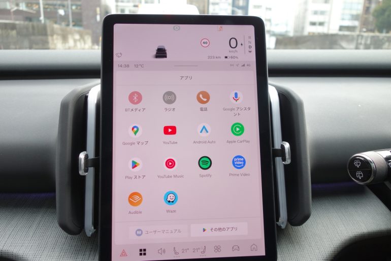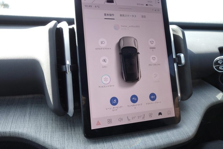 スピードメーター、ナビ機能、時計、外気温時計、エアコンやオーディオ操作、ドアミラー調整、2026年モデルでオフ/低/高の3モードが選べるようになった完全停止まで行えるワンペダルモードなどの各種機能が配置されている(速度、時刻、アプリ表示を含め、どの文字も細く小さすぎる印象だが・・・)。