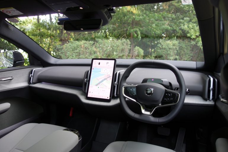 ステアリング奥にメーターパネルがないEX30のメーター&インフォテイメント&各種操作機能はインパネ中央の12.3インチタブレット型センターディスプレーに集約。