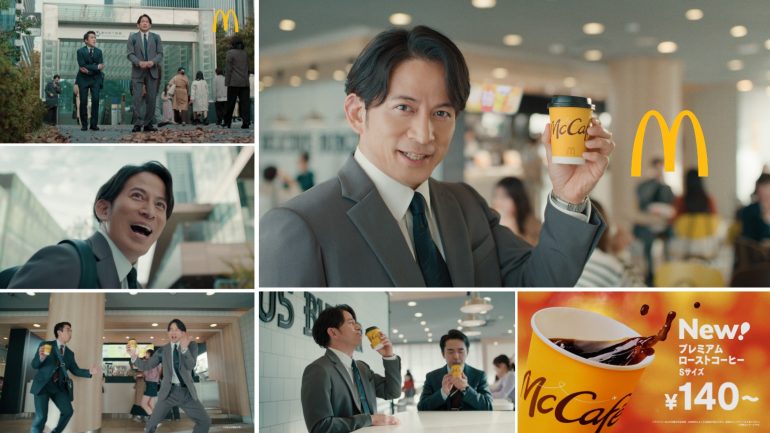 オフィス街で寒さに震える岡田さんが、「♪のみにいこー」と『TOKIO』の替え歌に乗せてマクドナルドへ。リニューアルしたプレミアムローストコーヒーをスキマ時間に、気軽に楽しめる魅力を描いたCMとなっている。