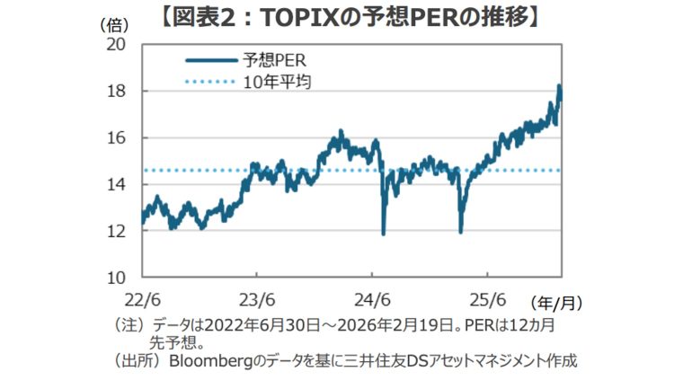 (2)予想株価収益率(PER)は過去平均から上振れした「割高状態」が続き(図表2)、そして、