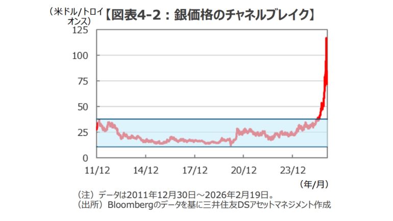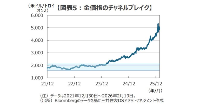 しかし、2024年3月に2,100ドルのレンジ上限を「ブレイクアウト」して力強い上昇トレンドが出現し、その後は押し目らしい押し目を作ることなく上昇を続け、2026年1月末には約2.7倍となる1トロイオンス当たり5595.47ドルまで上昇した(図表5)。