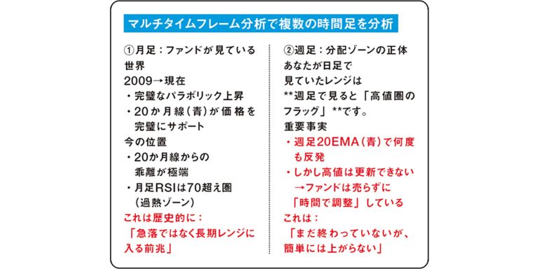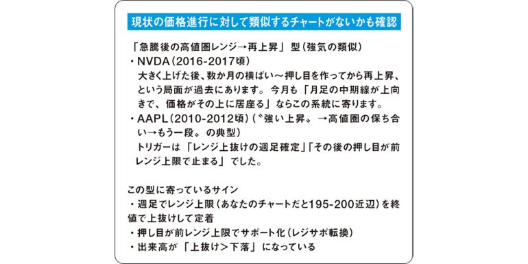 上記は、とある銘柄の株価動向を読み込ませた結果。エントリーポイントを見計らう判断材料として「長期レンジに入る前兆」(月足から分析)だが「簡単には上がらない」(週足から分析)という回答を得た。