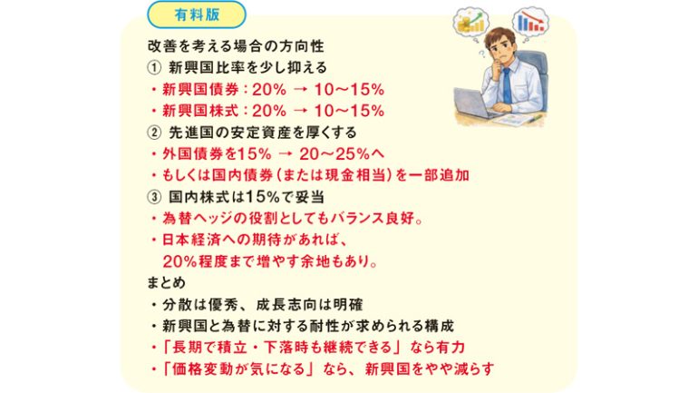 入力したのはこちらの想定ポートフォリオ。ただ単にリスクについて分析するだけでなく、具体的な数字を交えながら「改善を考える場合の方向性」を3つのパターンで丁寧に解説してくれた。