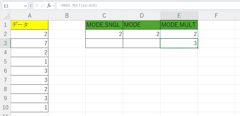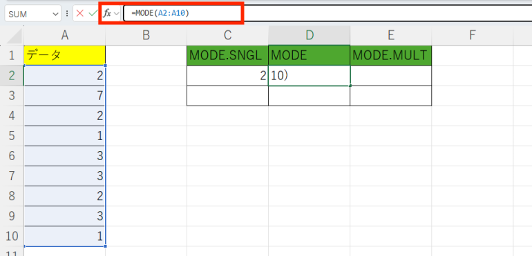 以下では「=MODE(A2:A10)」としている。