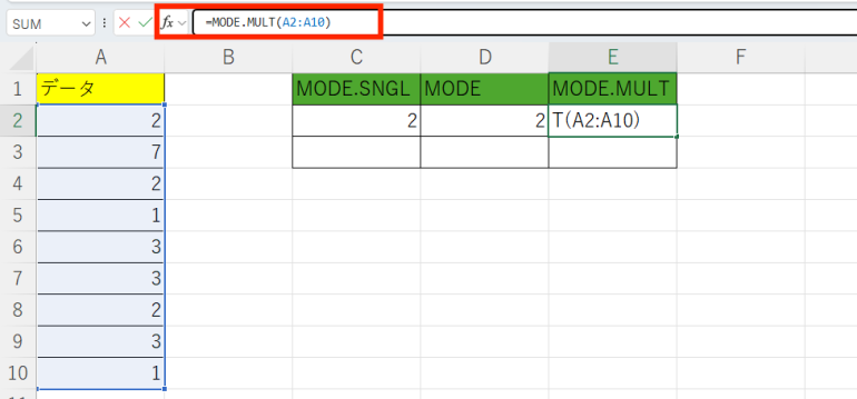 以下では「=MODE.MULT(A2:A10)」としている。
