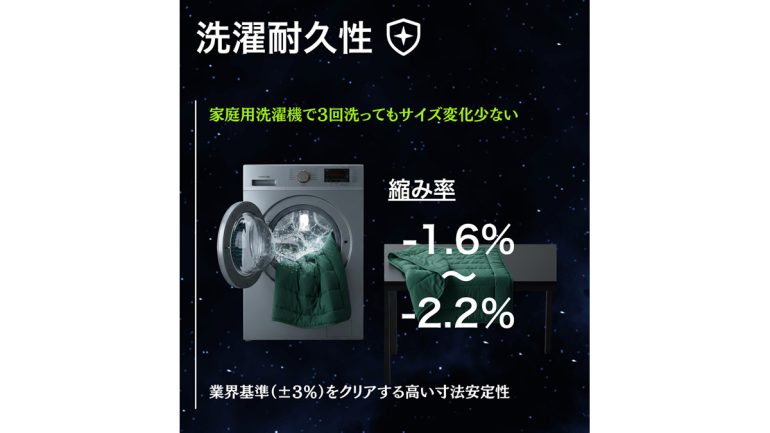 米国の第三者機関による洗濯試験(AATCC 135)において、3回洗濯後の収縮率はわずか約2%前後。業界基準の3%を大きく下回る高い形状安定性を証明している。