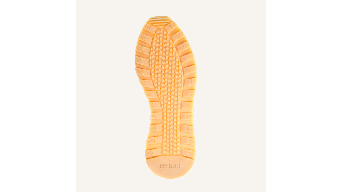 テストーニならではのレーザーカットデザインをアッパー全体に施し、ホワイトとハニーを組み合わせた新しいトレッドラバーソールが、洗練された表情と軽快な履き心地をもたらす。