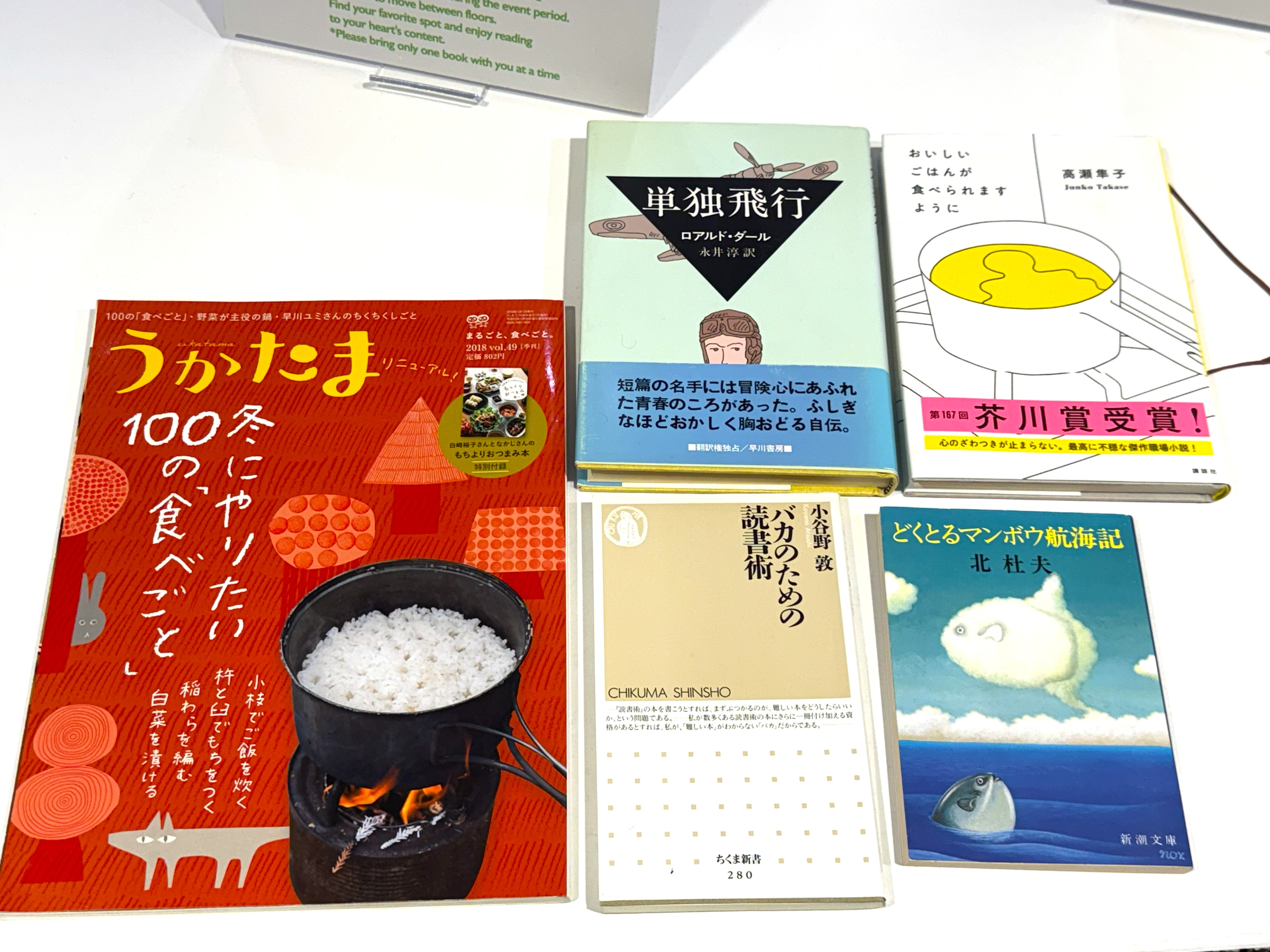 会場を一巡して気づいたのは、歴史小説、時代小説が多いこと。時代小説は常に新刊が出ているのを目にするので、一定のファンがいるのだろうが、古書としては売れにくいという現象のあらわれなのかもしれない。また筆者が主に読むのは海外の翻訳小説だが、会場で見つけた翻訳小説は、ロアルド・ダールの「単独飛行」1冊のみだった。これも、翻訳小説の刊行数が減っていることを象徴しているのかもしれないと、さびしく思いつつ、運命を感じてその1冊を持ち帰る5冊の中に加えた。中学生の頃に愛読した北杜夫の「どくとるマンボウ航海記」(昭和30年代の出版)があって、これも加えた。